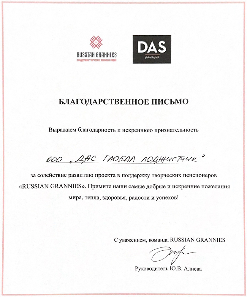 Социальный проект «Russian Grannies» существует с 2018 года, и мы рады, что компания ДАС ГЛОБАЛ ЛОДЖИСТИК внесла свой вклад в развитие такого важного проекта.