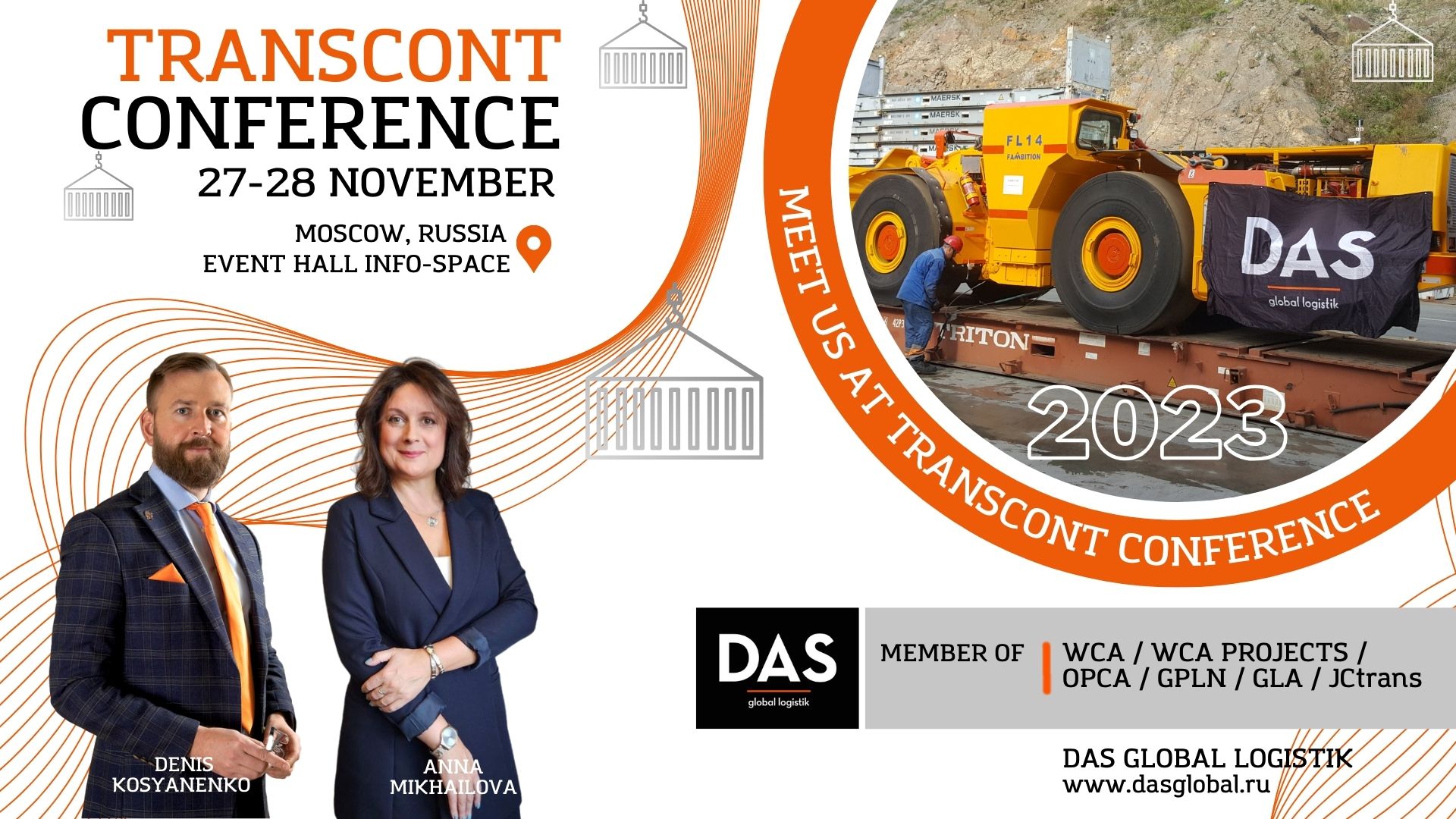 Наши коллеги, Денис Косьяненко, руководитель международного отдела по развитию бизнеса, и также Анна Михайлова, менеджер по стратегическому планированию развития международного отдела, представят компанию DAS GLOBAL LOGISTIK на международной конференции «ТрансКонт 2023».